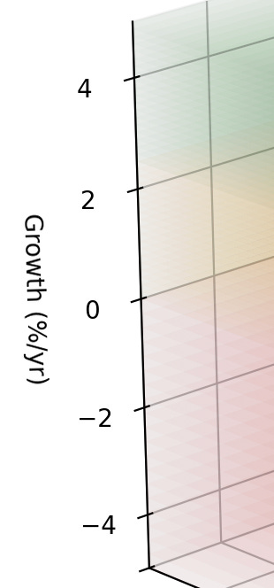 Economic Growth (% ): Often viewed as the primary indicator of societal progress, economic growth drives our ability to invest in health, education, infrastructure (stuff) and technology. But it also drives, and is coupled to, our consumption of resources and energy. As currently shown, the Growth axis ranges from -5% (significant contraction) to +5% (significant expansion):