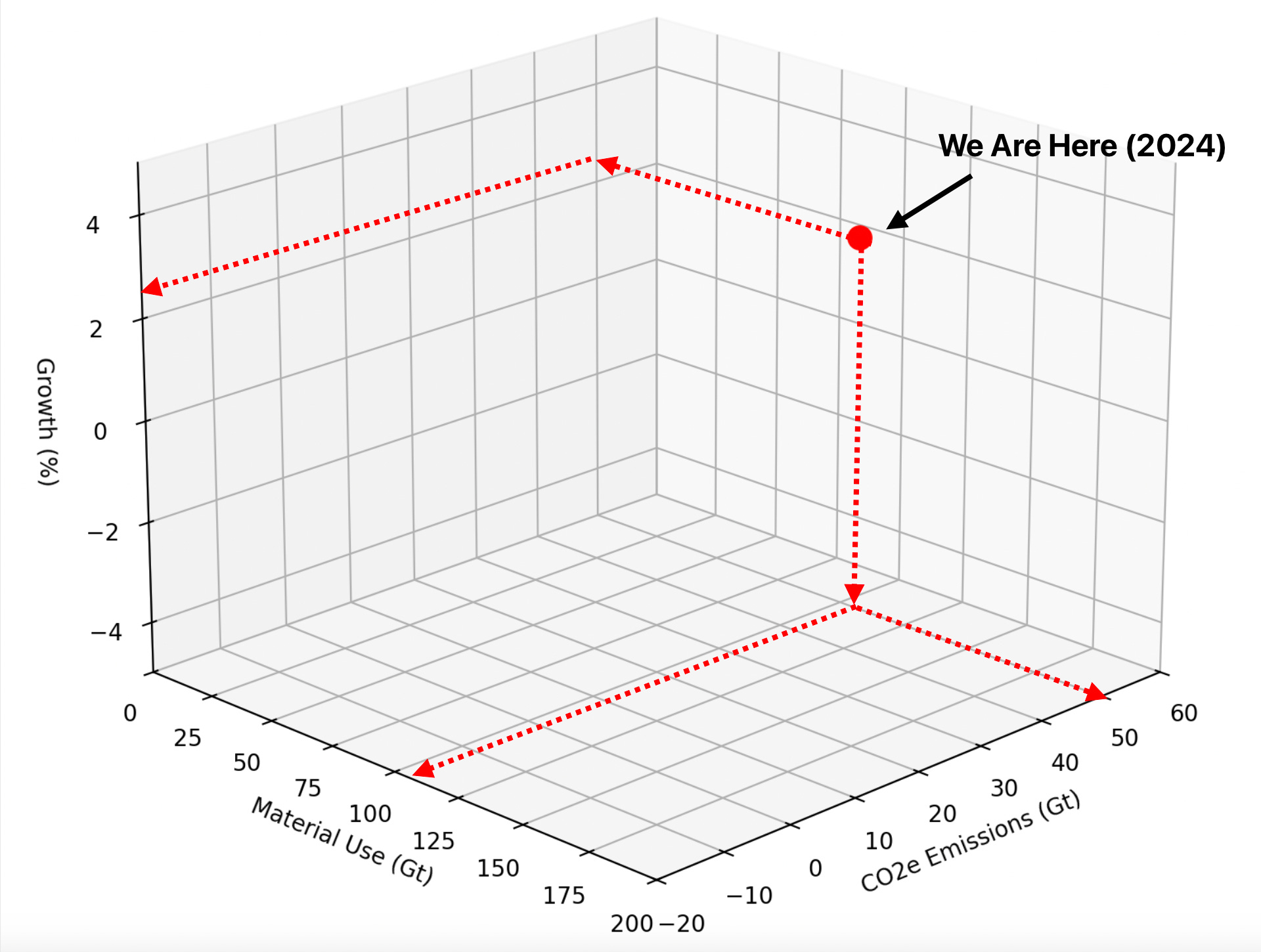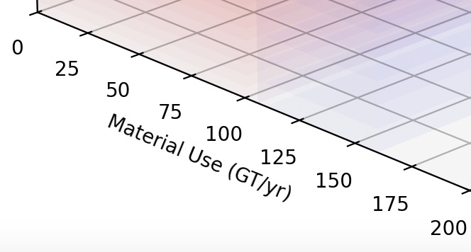Material Use (Gt): This represents the physical throughput of civilization—the extraction, transformation, and consumption of natural resources to meet human needs… which also generates significant carbon emissions while doing so. As currently shown, the Material Use axis ranges from 0 Gt per year (we don’t extract “negative” materials!) to +200 Gt per year (significant extraction). As of 2024 we are consuming ~106 Gt per year, with predictions expecting this to rise to ~160 Gt per year by 2050: