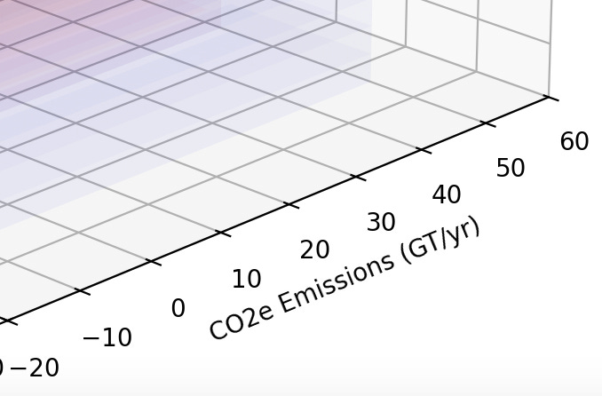 CO2e Emissions (Gt): This is a proxy for our climate impact. The burning of fossil fuels to sustain our economies and lifestyles accounts for the majority of global greenhouse gas emissions. As currently shown, the CO2e Emissions axis ranges from -20 Gt per year (significant carbon “drawdown”) to +60 Gt per year (significant increase):